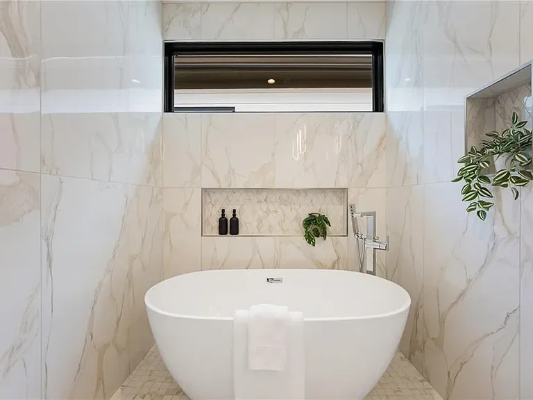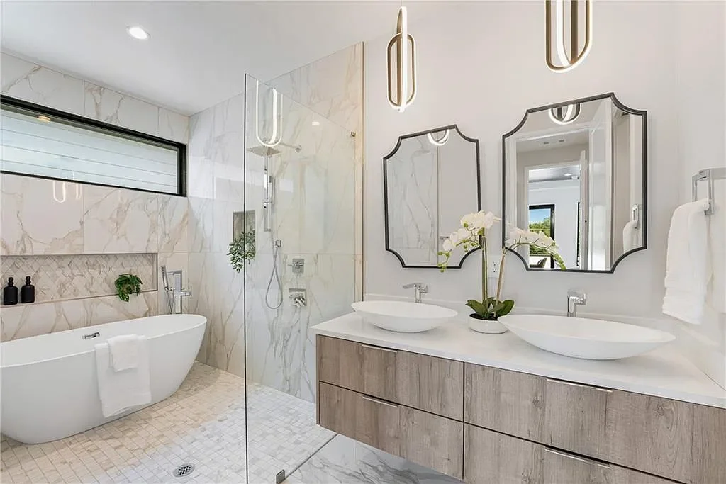 The primary suite offers a true retreat with a walk-out balcony, floating dual vanities, a deep soaking tub, and a spa-inspired walk-in shower.